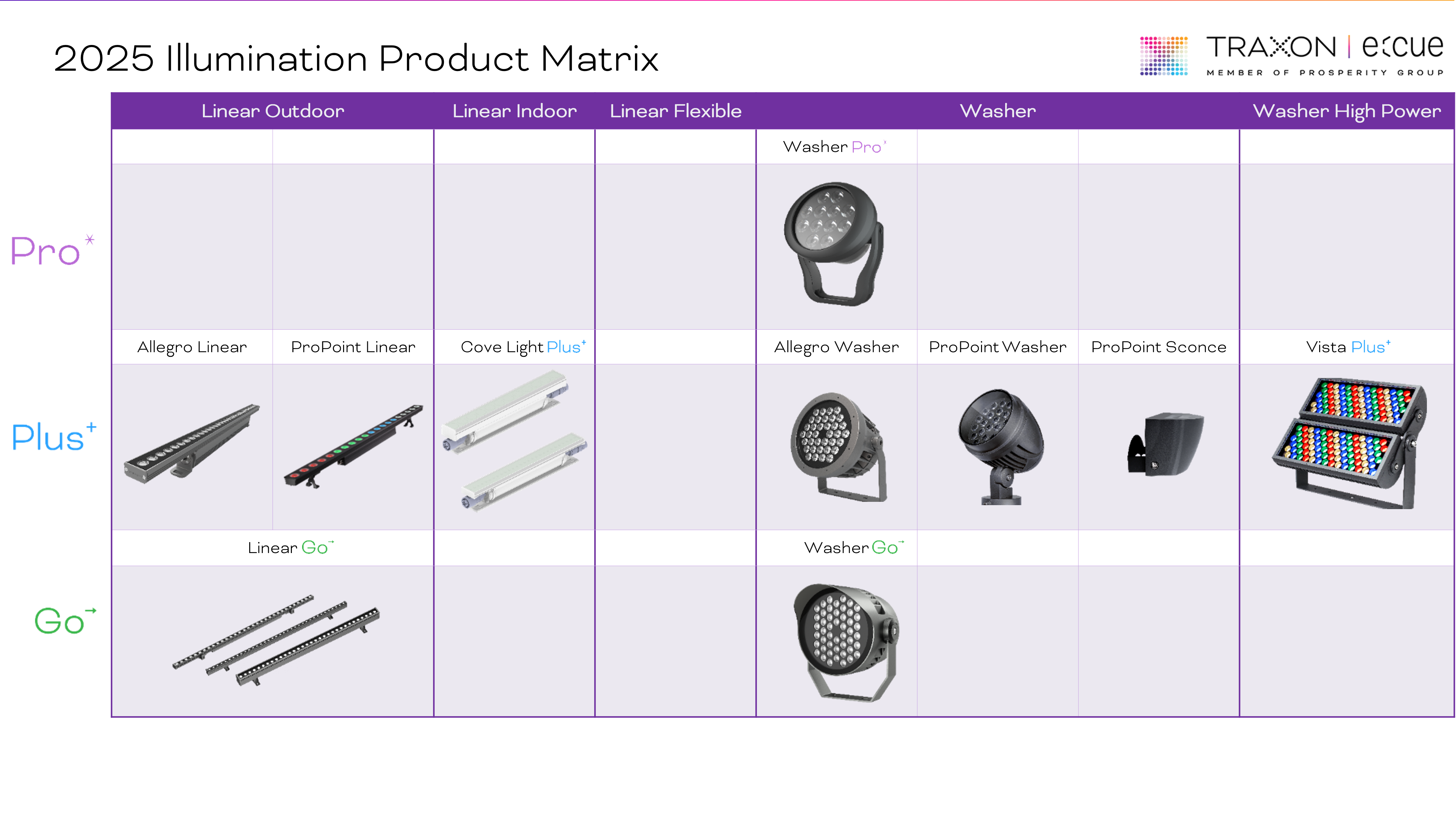 Introducing Pro, Plus and Go, the three Traxon product tiers thoughtfully designed to cater to your unique requirements, featuring a diverse range of performance options and budgets to suit every project.